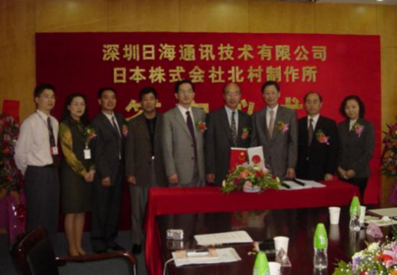 2004年4月13日,公司与日本株式会社北村制作所就户外一体化机房的设计、生产、销售和服务在日海智能签订了合作协议,共同合资组建深圳北村日海机房技术有限公司,并举行了隆重的签字仪式。公司周展宏董事长、王文生总裁、杨飞董事、机房事业部负责人孟庆光和日本北村制作所北村泰作...